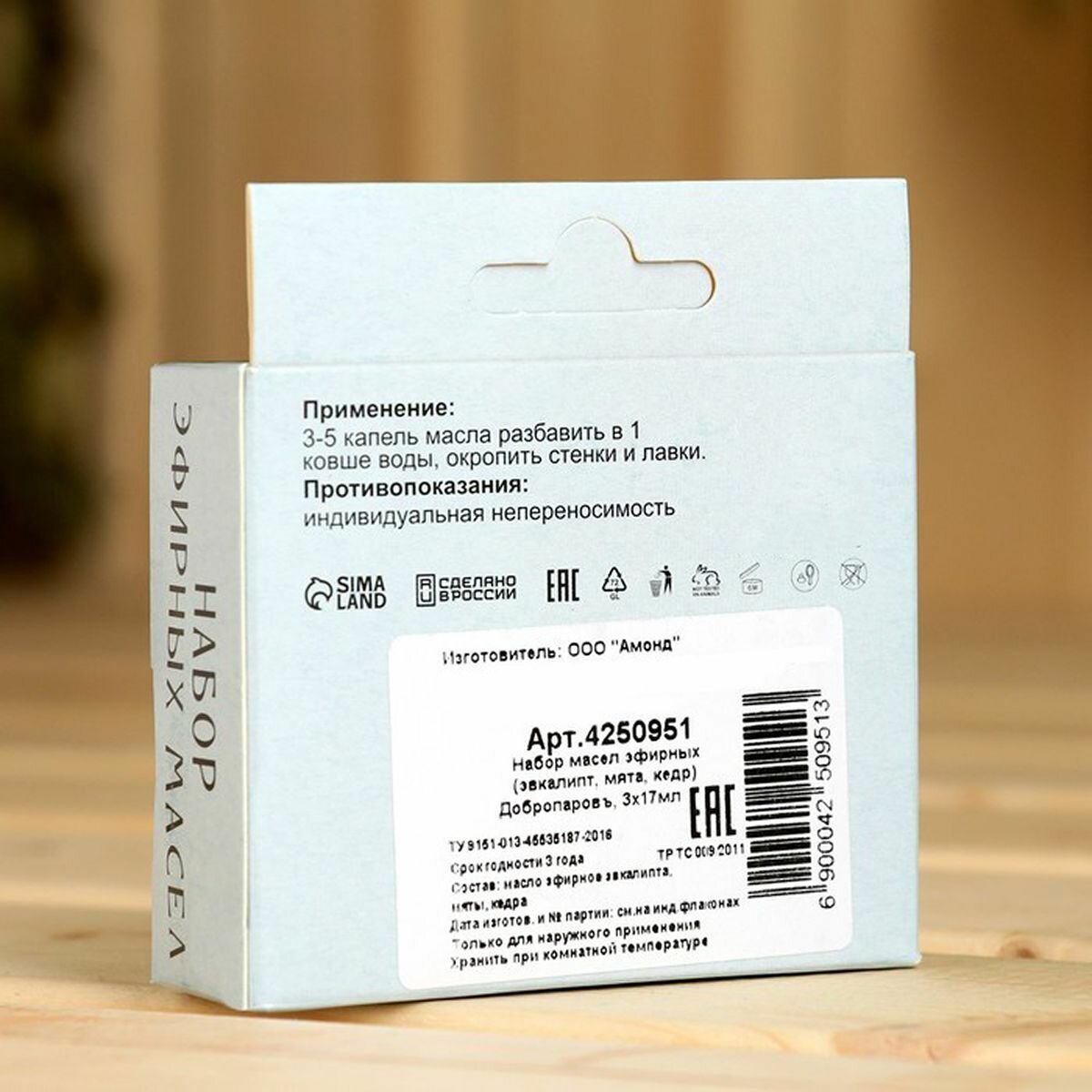 | Способ применения | для бани и сауны: добавить 3-5 капель масла на 1 литр горячей воды для подачи на каменку |