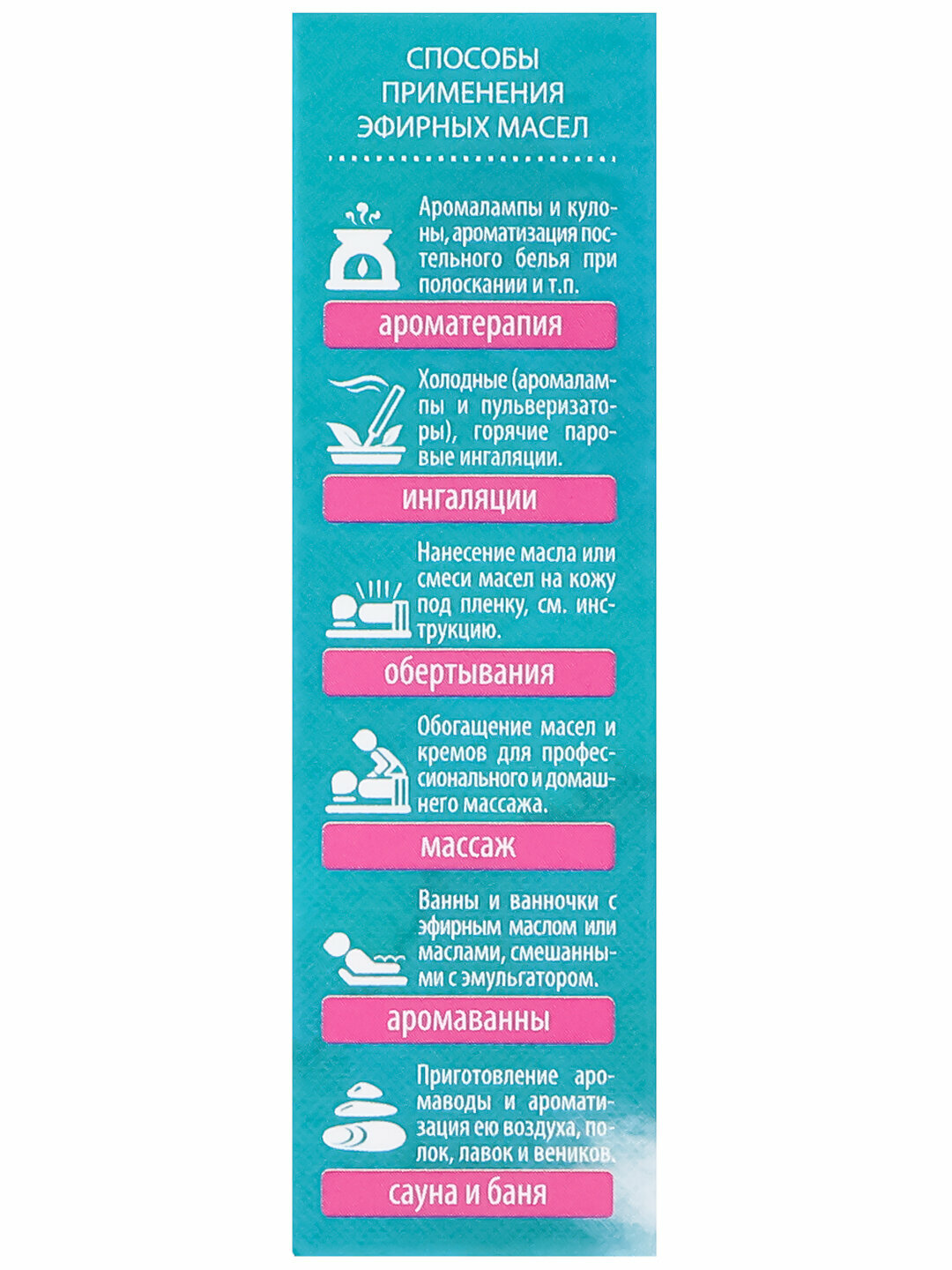 | Способ применения | Ароматерапия, ультразвуковой аромадиффузор, баня, ванна, косметика, массаж |