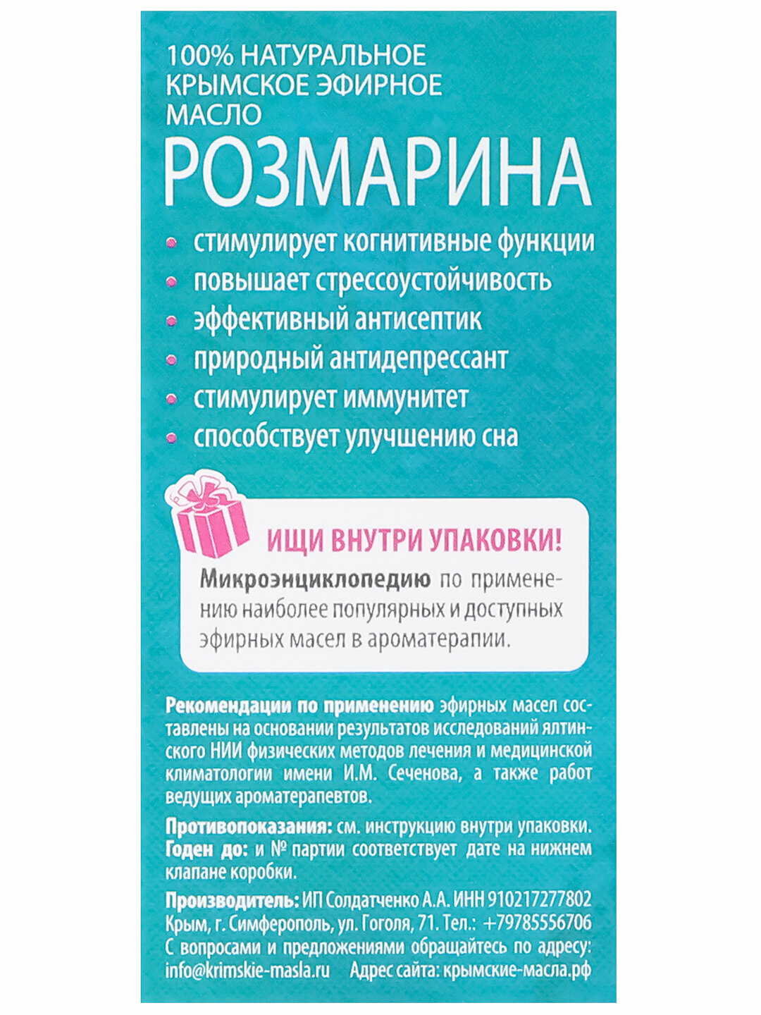 | Меры предосторожности | только для наружного применения, не использовать в чистом виде, при индивидуальной непереносимости, детям до 3-х лет, в период беременности, при сердечно - сосудистых заболеваниях |