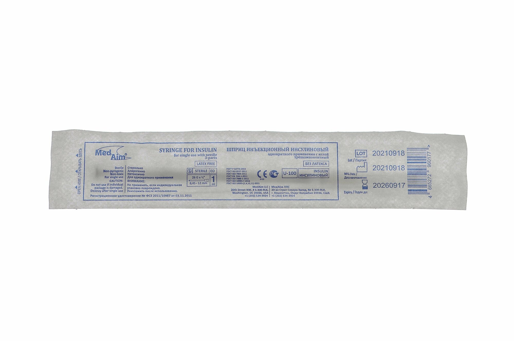 Шприц инсулиновый однократного применения MedAim U-100 с иглой (1 мл, 26G (0,45х12 мм), 100 шт, Luer)