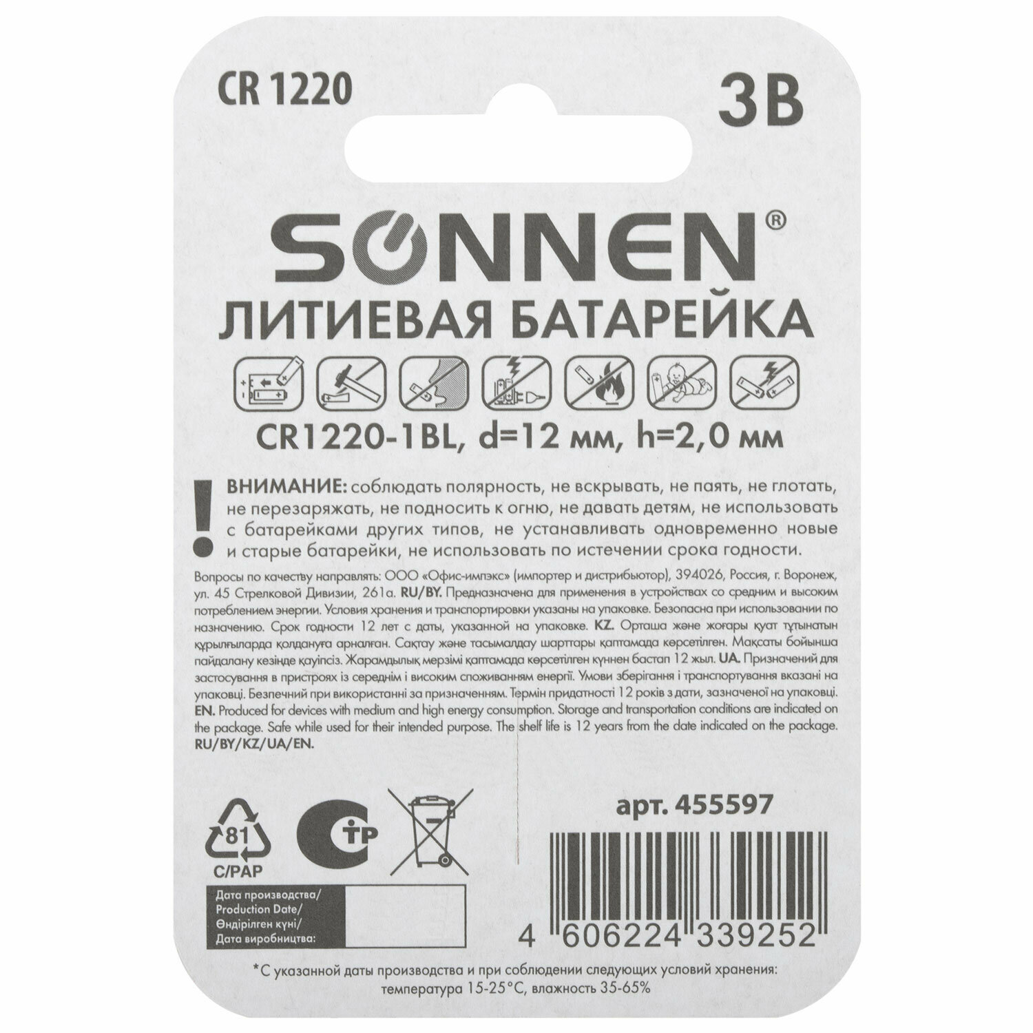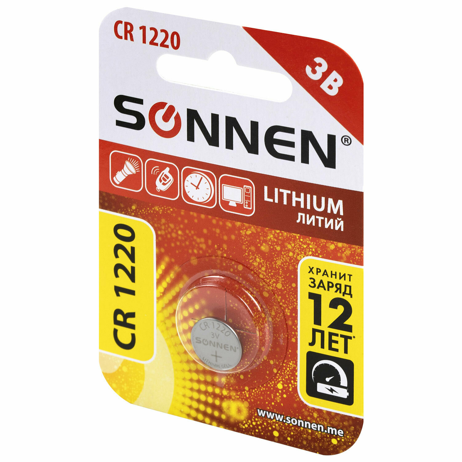 Батарейка литиевая CR1220 1 шт. "таблетка, дисковая, кнопочная", SONNEN Lithium, в блистере, 455597