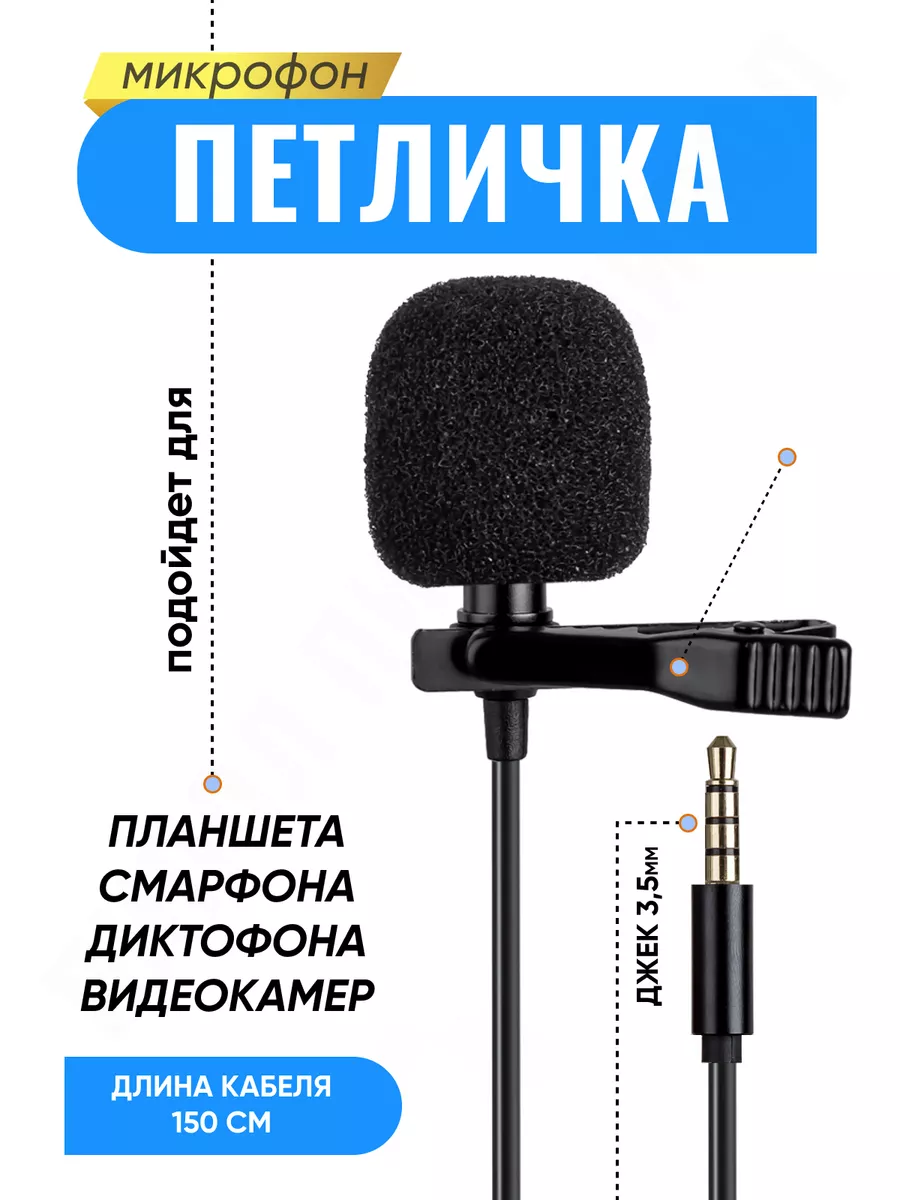 Купить 2 Микрофона петличный проводной для телефона, петличка на одежду для записи звука, стрима блогеров, с ветрозащитой, портативный