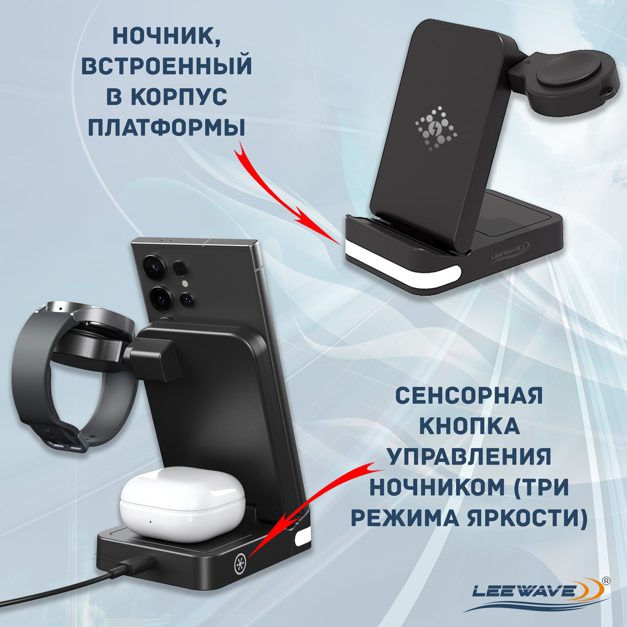 | Конструкция беспроводного устройства | для 1 телефона / зона для беспроводных наушников / зона для умных часов |