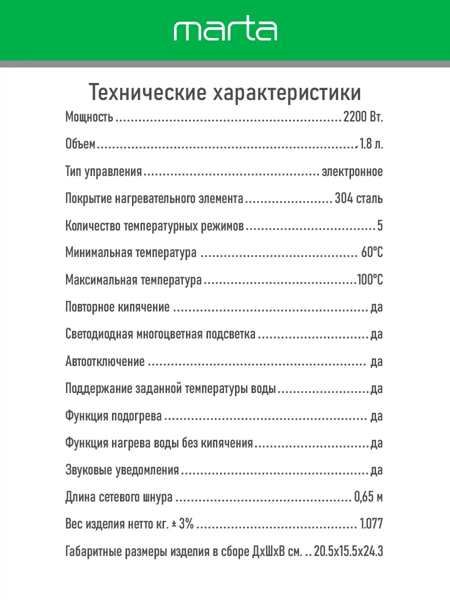 Ниже Вы можете прочитать отзывы на Электрический чайник MARTA MT-4611 черный с контролем температур, умный 1.8 л, ознакомится с подробными характеристиками, посмотреть интересные обзоры и фотографии на Электрический чайник MARTA MT-4611 черный с контролем температур, умный 1.8 л.