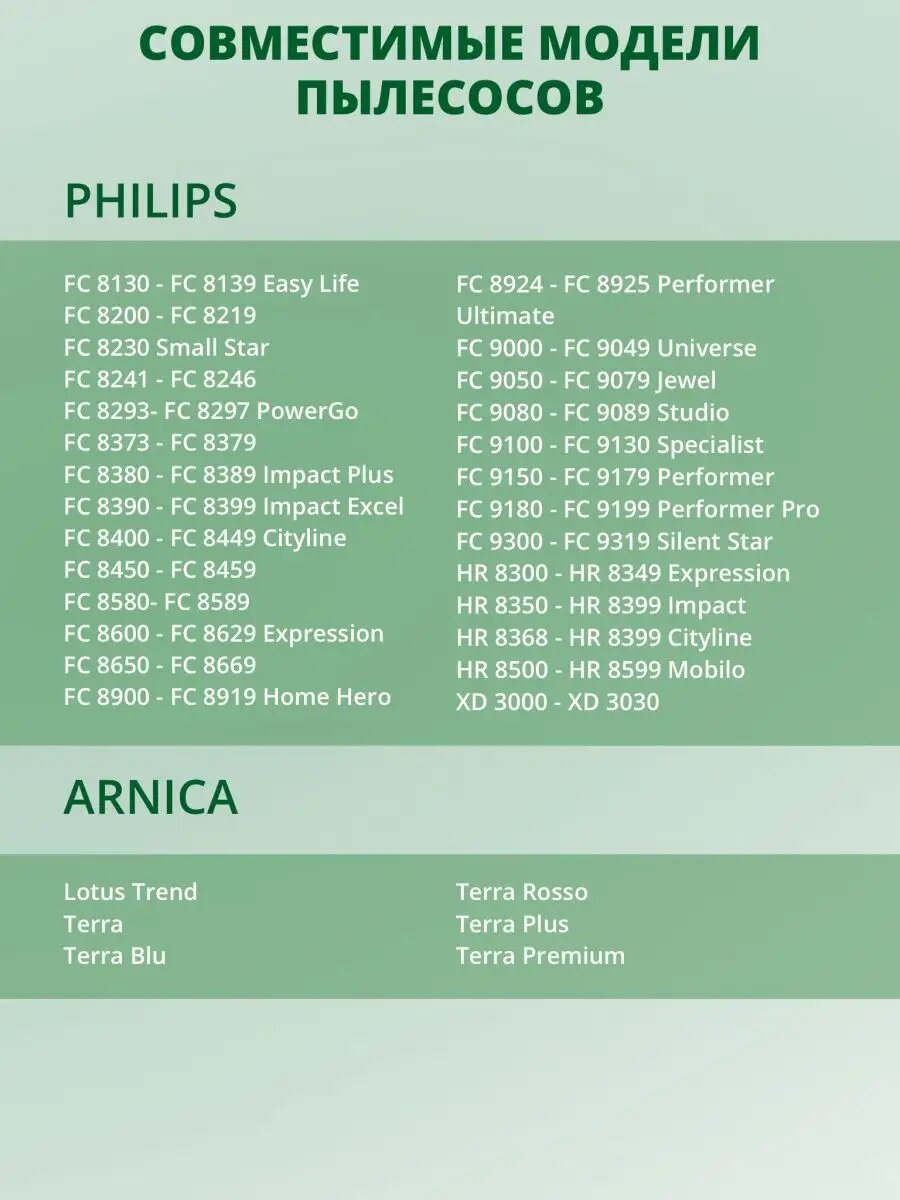 | Производитель совместимого пылесоса | ARNICA, Electrolux, Philips |