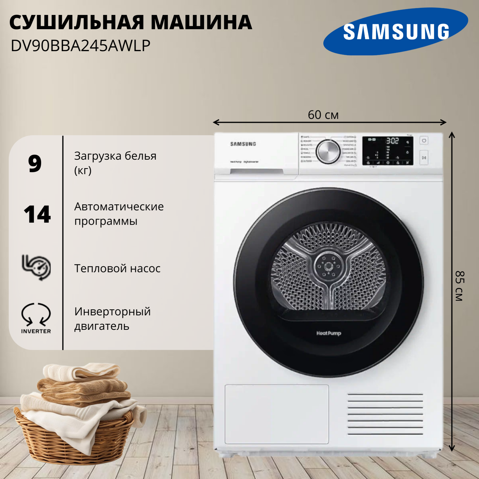 Купить Сушильная машина SAMSUNG DV90BBA245AWLP с тепловым насосом, загрузка 9 кг, 14 программ, А+++, белый