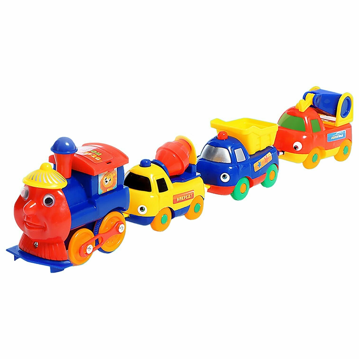 Купить Поезд с машинками "Весёлый паровоз" на батарейках, большая пластиковая машинка-игрушка для малышей, магнитная сцепка, набор 4 шт.