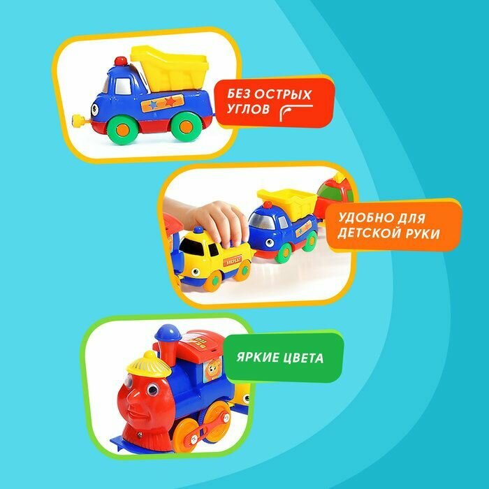 Поезд с машинками "Весёлый паровоз" на батарейках, большая пластиковая машинка-игрушка для малышей, магнитная сцепка, набор 4 шт. интересное: