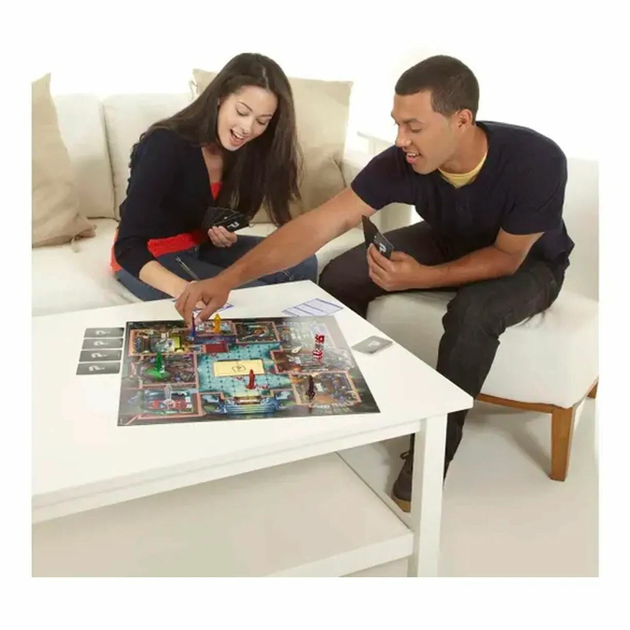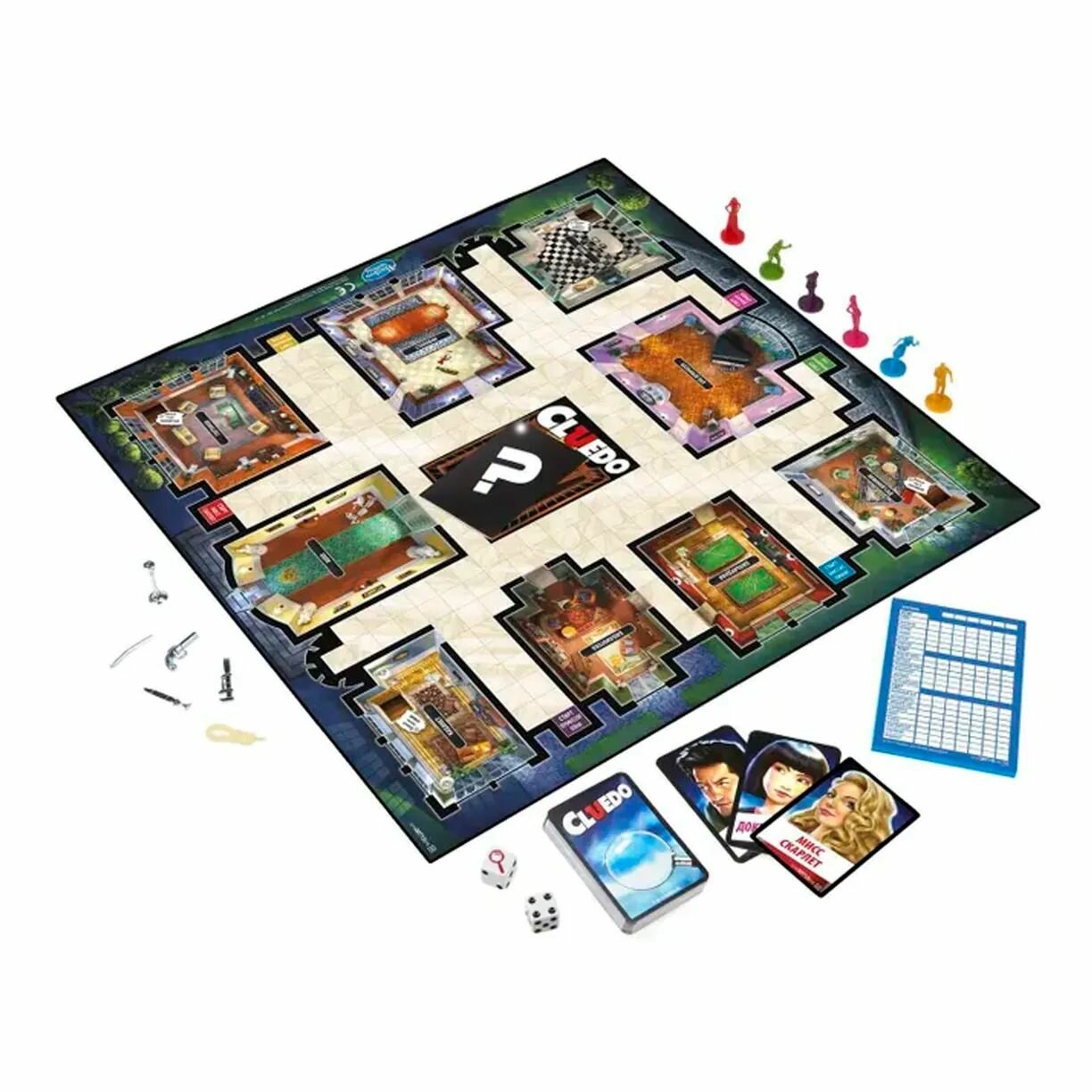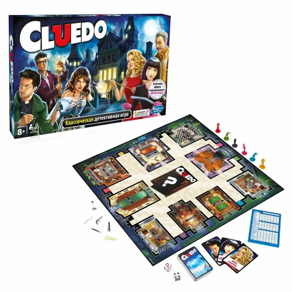 | Дополнительная информация | Комплект игры игровое поле особняка, желтый конверт для карточек убийства, блокнот детектива, 6 фишек гостей, 21 черная карта, 13 красных бонусных карт, 6 фишек оружия, 2 кубика и руководство для игры. |