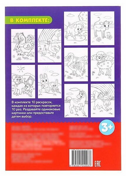 | Дополнительная информация | Комплект тематических раскрасок создан специально для занятий в детском саду. Внутри издания вы найдёте 10 сюжетов по 10 листов каждого: раздайте всем детям одинаковые или предоставьте сюжет на выбор. Листы раскраски легко отрываются, при этом блок не рассыпается. Такой комплект подойдёт и для домашнего использования, например на случай праздника, когда нужно будет занять детей тихими играми. Подходит для раскрашивания карандашами, фломастерами и акварелью. |