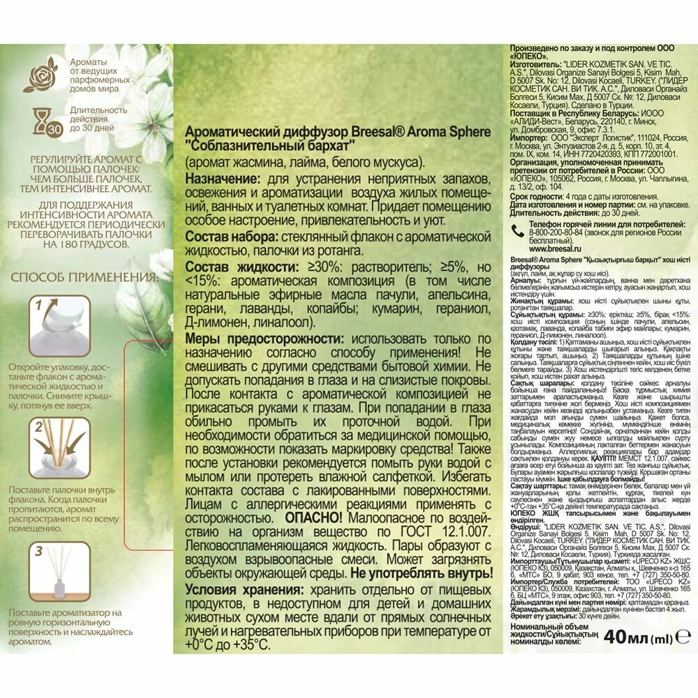 | Дополнительная информация | Для ароматизации помещения и придания ему особой атмосферы и настроения необходимо открыть коробку, открыть флакон и вставить в него палочки. Интенсивность аромата можно регулировать количеством палочек. Чем меньше палочек, тем менее интенсивный аромат. Для освежения аромата рекомендуется раз в неделю переворачивать палочки на 180 градусов. |