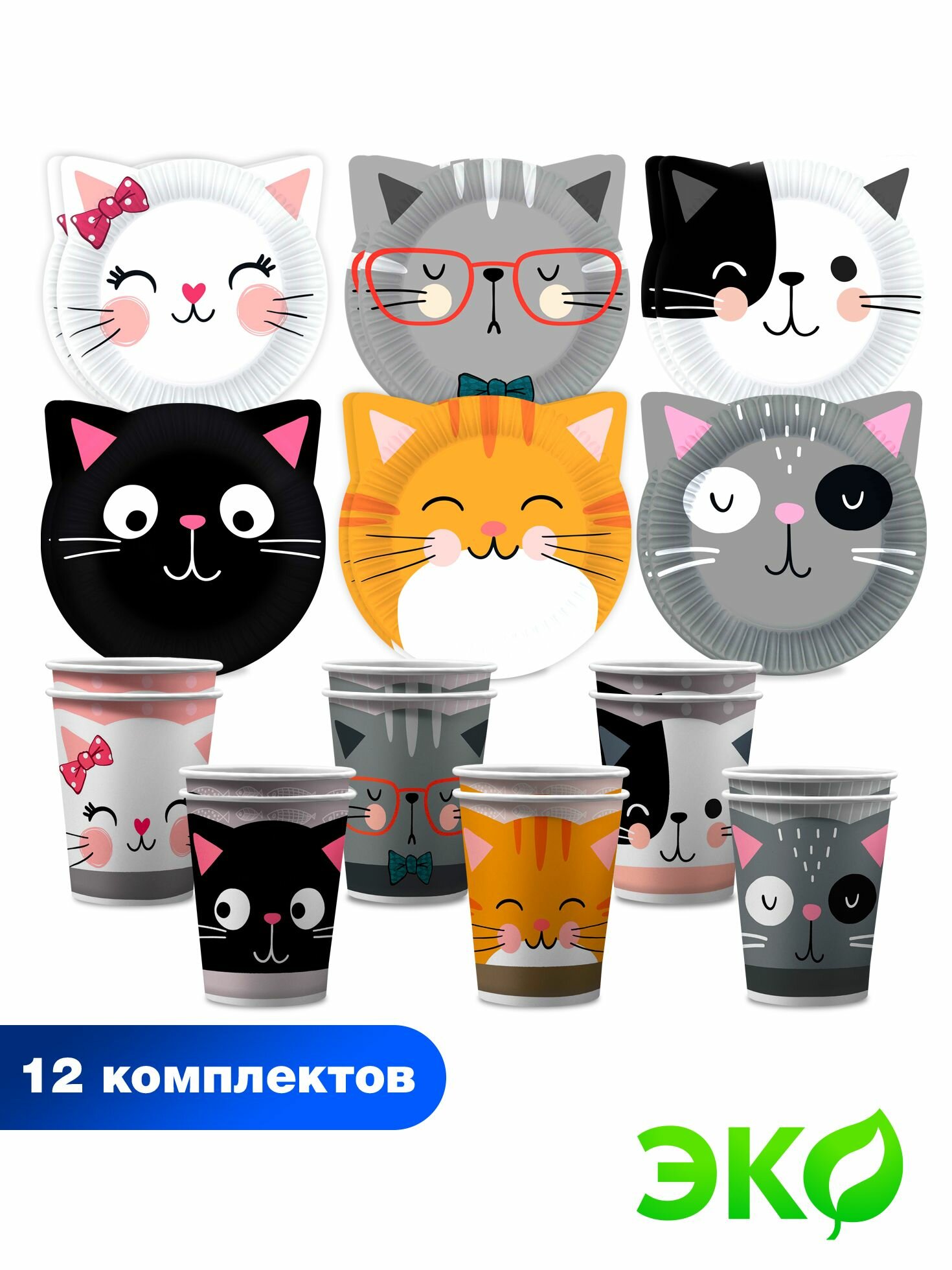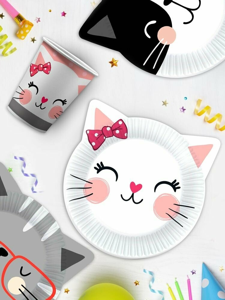 Купить Набор одноразовой бумажной посуды для праздника ND Play / Кошки с ушками (тарелка 18 см, стакан, по 12 шт.)
