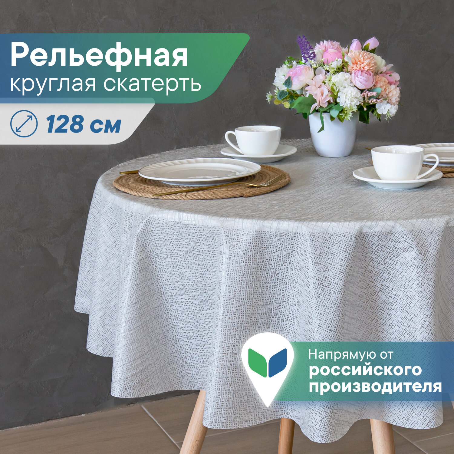 Скатерть круглая клеенка на стол ПВХ VILINA "Элегия" диаметр 128 см. водонепроницаемая с узором / скатерть праздничная белая 005-white