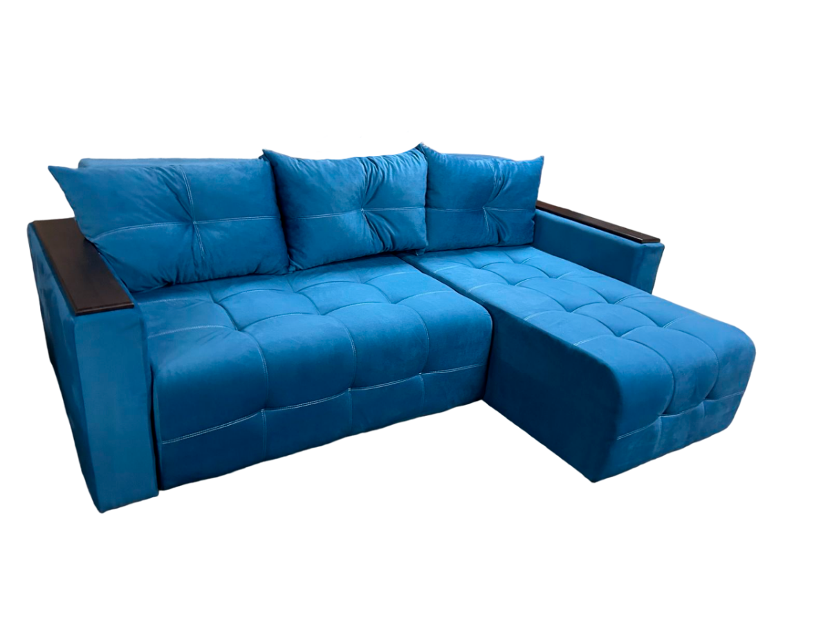 Диван угловой Вегас Люкс с деревянными подлокотниками, правым углом и независимым пружинным блоком (велюр cabrio 23, синий)