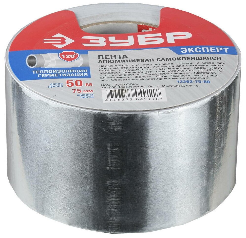 Алюминиевая лента, ЗУБР Профессионал 12262-75-50, до 120 °С, 60мкм, 75мм х 50м 12262-75-50