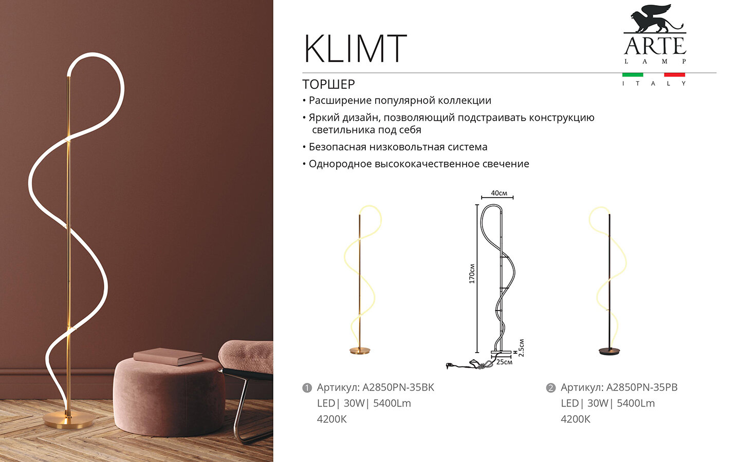 Торшер ArteLamp KLIMT A2850PN-35PB, LED, 30 Вт, металл, силикон, медный