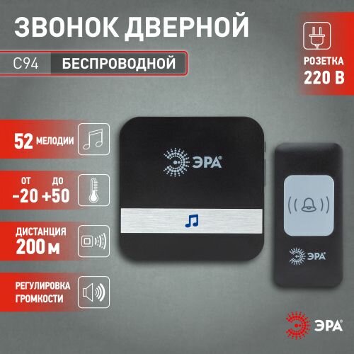 Купить Звонок дверной ЭРА С94 беспроводной, от сети, черный, 52 мелодии