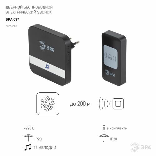 Эра звонок беспроводной C94 , 52 мелод., с кнопкой, 200 м, от сети/A23, черный 6321