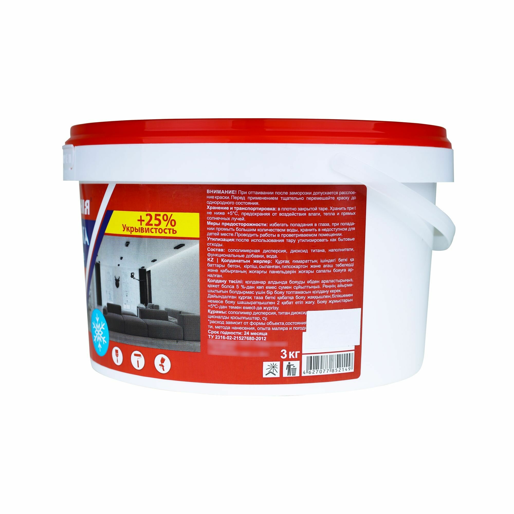 Краска для стен и потолков Первая линия интерьерная, быстросохнущая, акриловая, белоснежная 3 кг