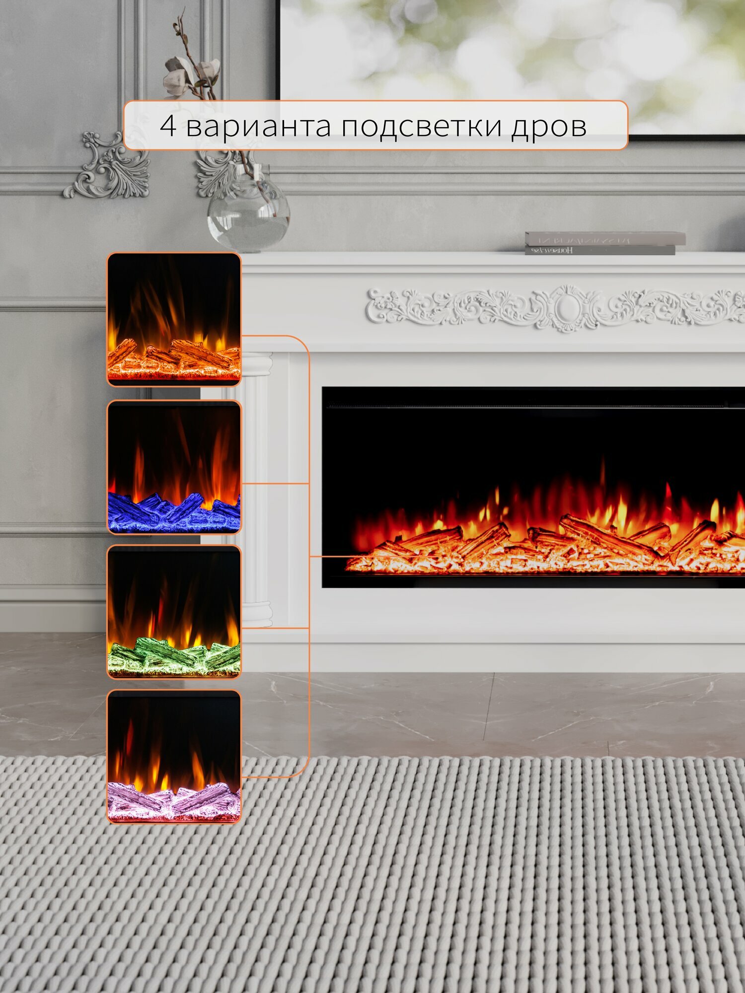 Камин электрический напольный ELEKAM Lines Pulsar 38 с очагом и порталом, обогревом и имитацией огня.
