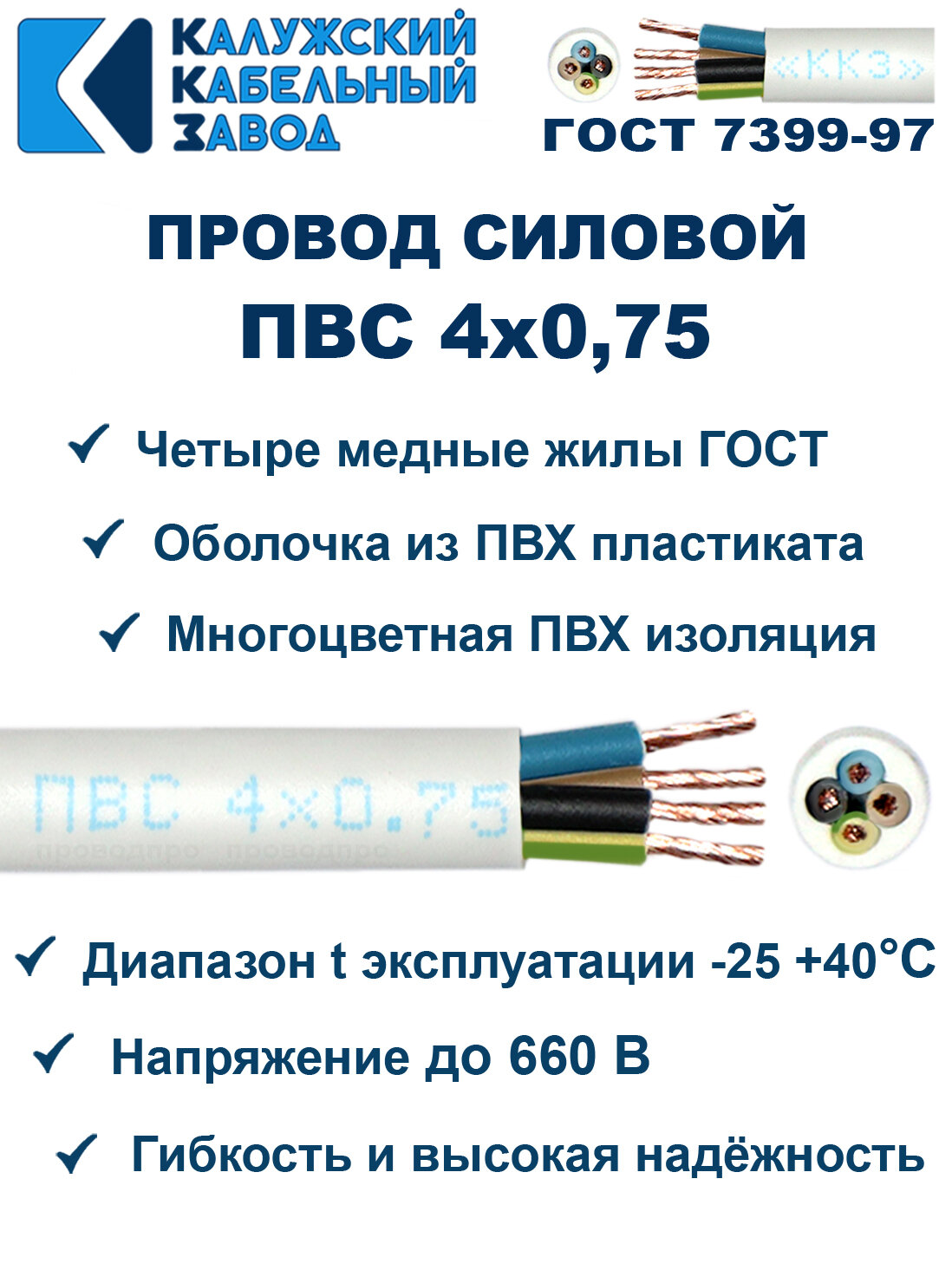 Провод ПВС 4х0,75 20метров ГОСТ Калужский кабельный завод