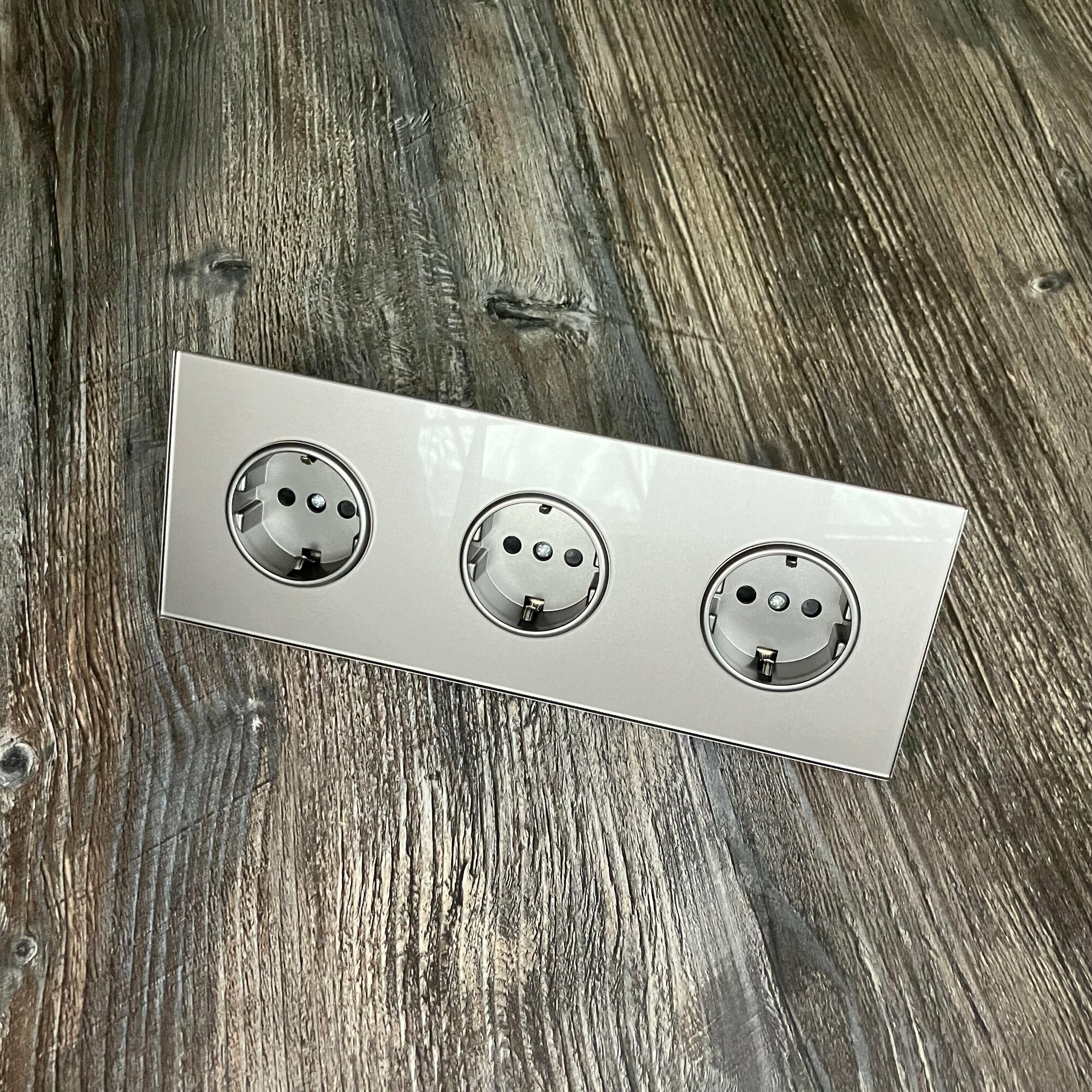Купить Розетка тройная 3 поста, 16А 250В, со шторками, рамка закаленное стекло, Серый. F8