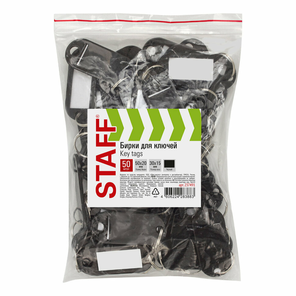 Бирки для ключей комплект 50 ШТ., длина 50 мм, инфо-окно 30х15 мм, черные, STAFF, 237491, 88