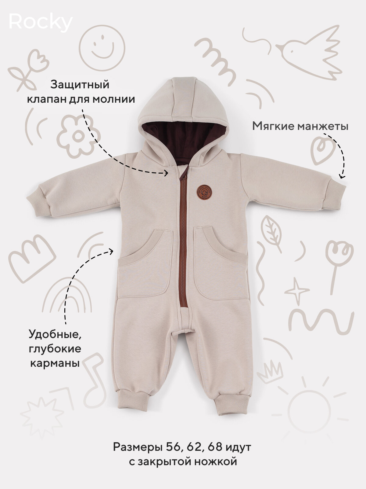 Комбинезон RANT, закрытая стопа, размер 62, молочно-коричневый