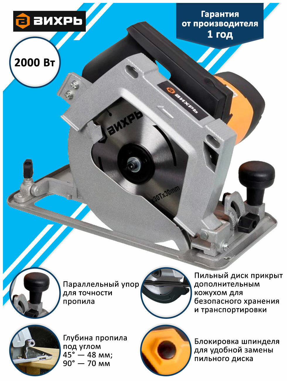 Дисковая пила ВИХРЬ ДП-200СТ, 2000 Вт