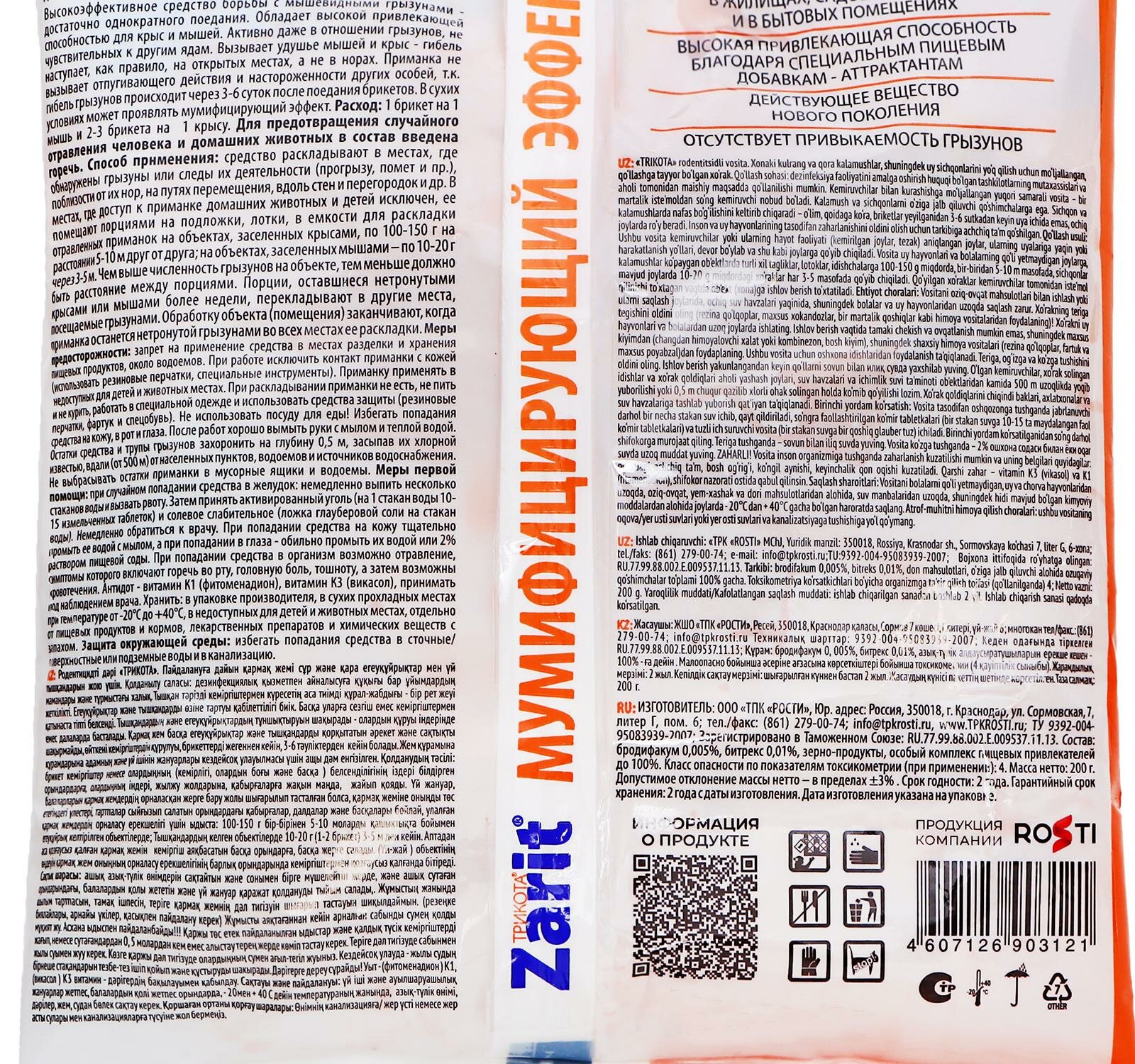 ТПК Рости ООО Средство от крыс и мышей Zarit, тесто-сырные брикеты, 200 г