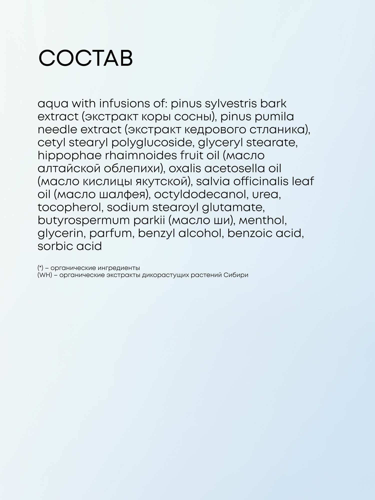| Состав | aqua, pinus sylvestris bark extract (экстракт коры сосны), pinus pumila needle extract (экстракт кедрового стланика), cetyl stearyl polyglucoside, glyceryl stearate, hippophae rhaimnoides fruit oil (масло алтайской облепихи), oxalis acetosella oil (масло кислицы якутской), salvia officinalis leaf oil (масло шалфея), оctyldodecanol, urea, tocopherol, sodium stearoyl glutamate, butyrospermum parkii (масло ши), меnthоl, glycerin, parfum, benzyl alcohol, benzoic acid, sorbic acid |