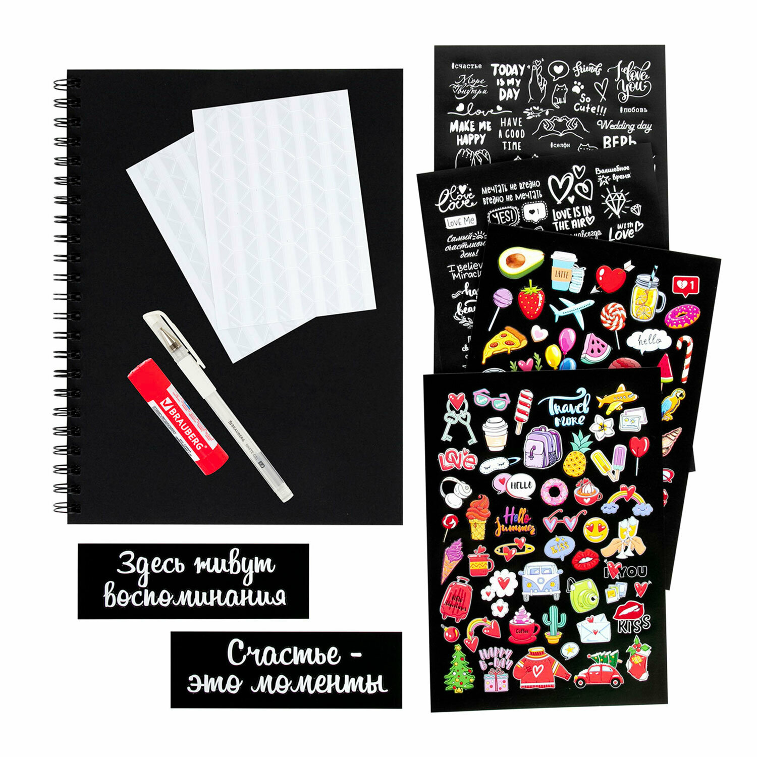 Фотоальбом Brauberg 21х30 см, 40 черных листов, уголки/стикеры/ручка/клей/трафареты/маркеры, BRG Black, 880654