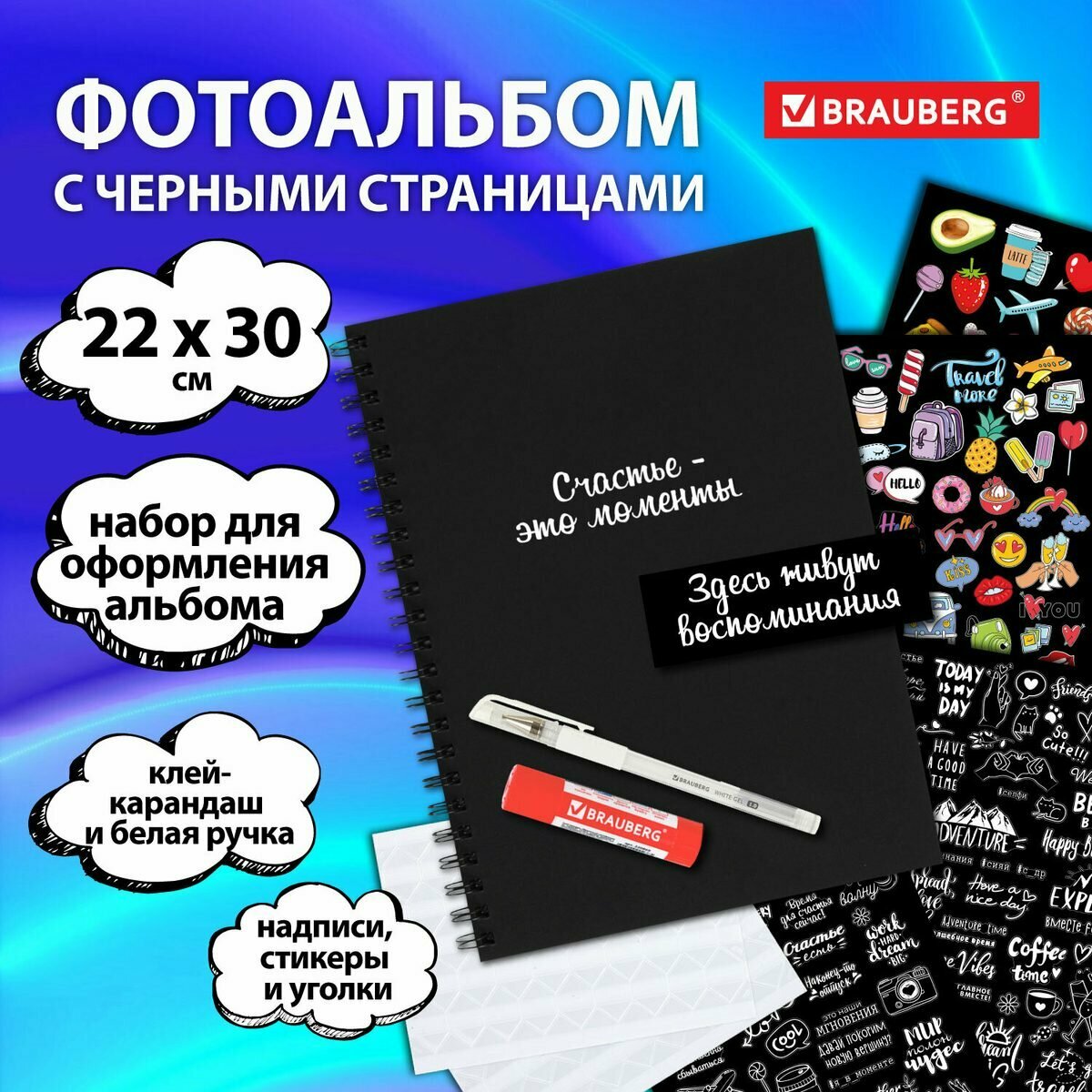 Фотоальбом детский семейный свадебный для фото с черными листами "Счастье – это моменты" 22х30 см, 24 черных листа, уголки, стикеры, ручка, клей, Brauberg, 391310