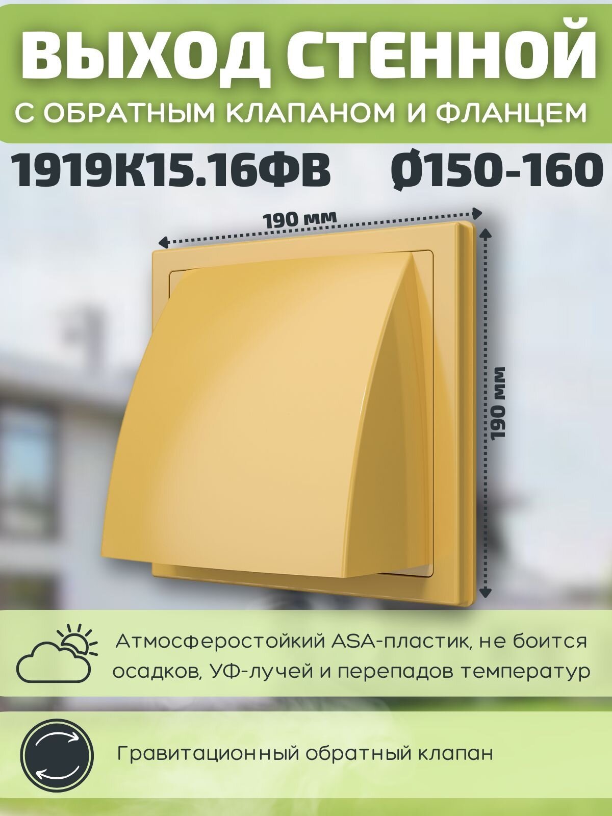 1919К15.16ФВ беж, Выход стенной вытяжной с обратным клапаном 190х190 с фланцем D150/160, ASA, беж