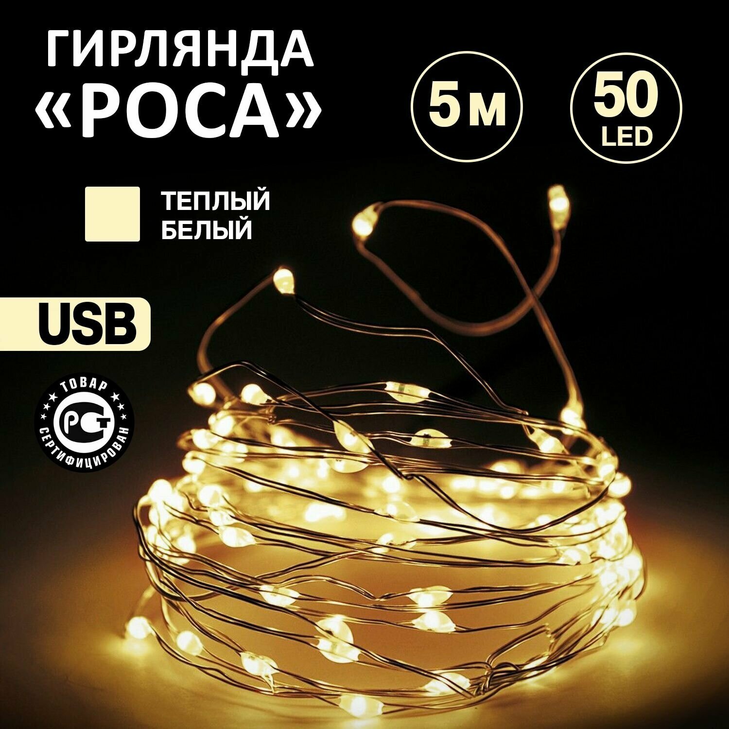 Светодиодная гирлянда Neon-Night "Роса" USB 10 м, теплое белое свечение, 100 LED / новогодние товары гирлянды / новогодняя распродажа / новогодние скидки / новогодние подарки