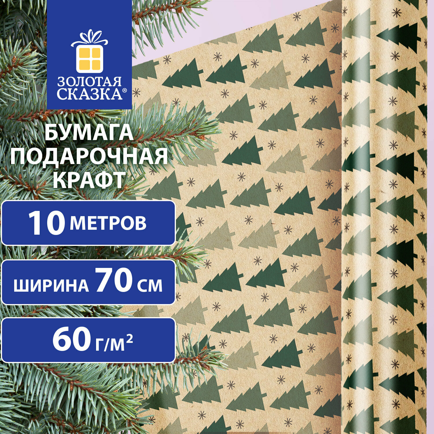 Бумага упаковочная подарочная крафт С эффектами BIG SIZE новогодняя "Green Trees", 0,7х5 м, золотая сказка, 591950