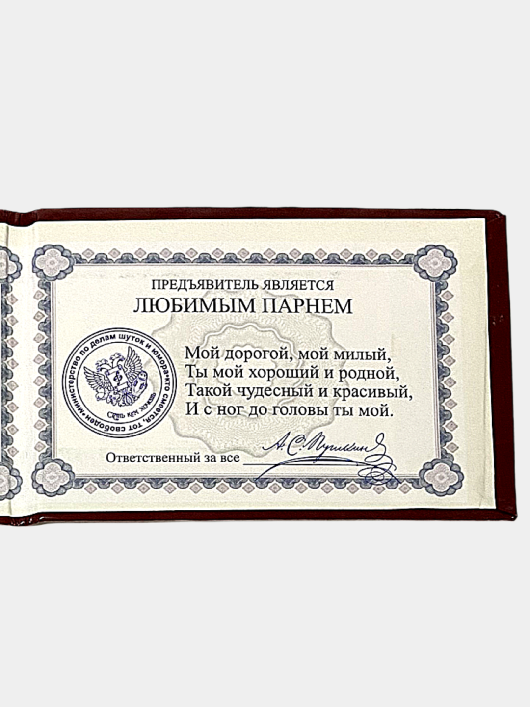 СохранитьШуточное удостоверение "Любимый парень", корочка интересное: