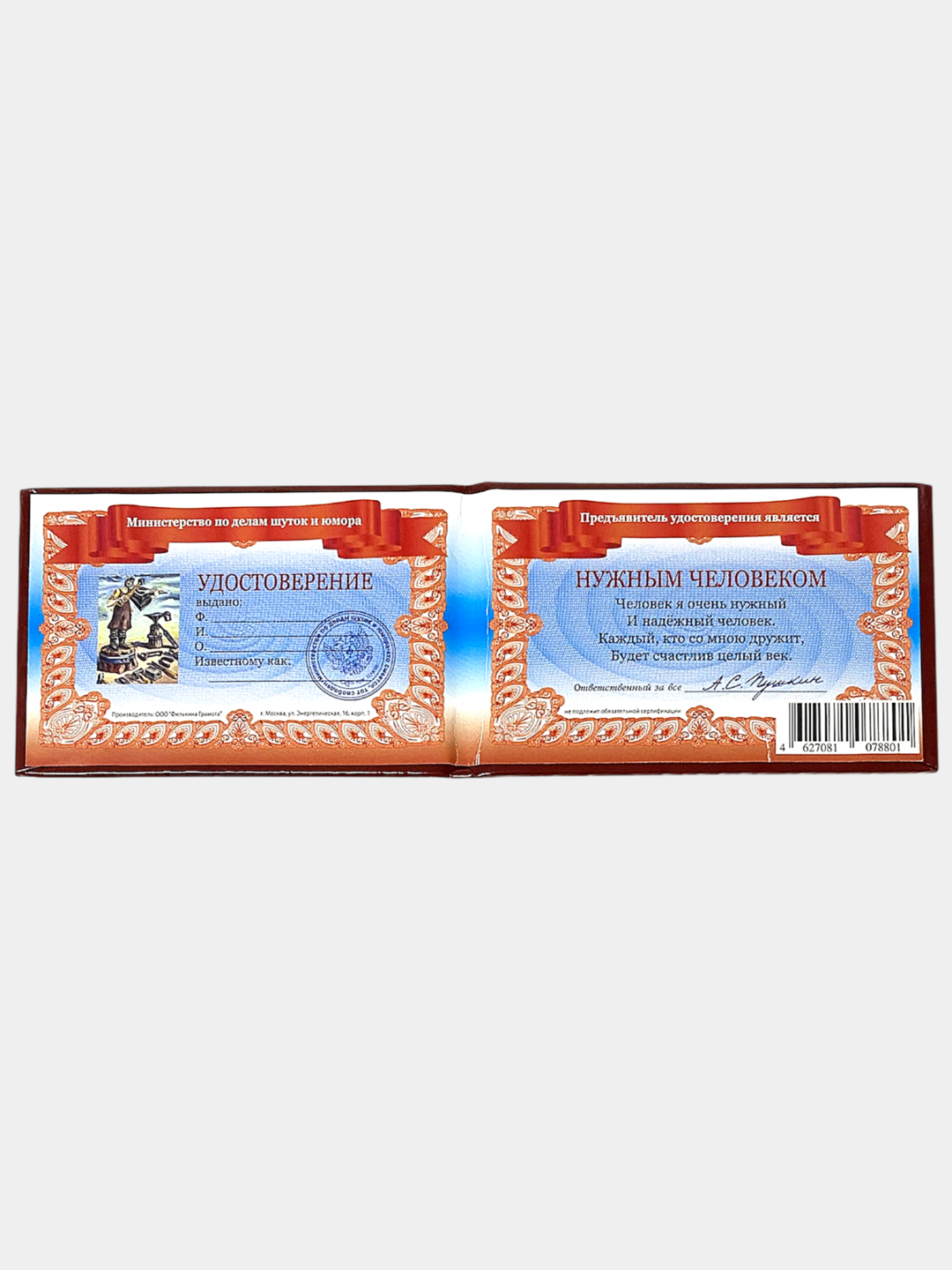 Купить Шуточное удостоверение "Нужного человека", корочка