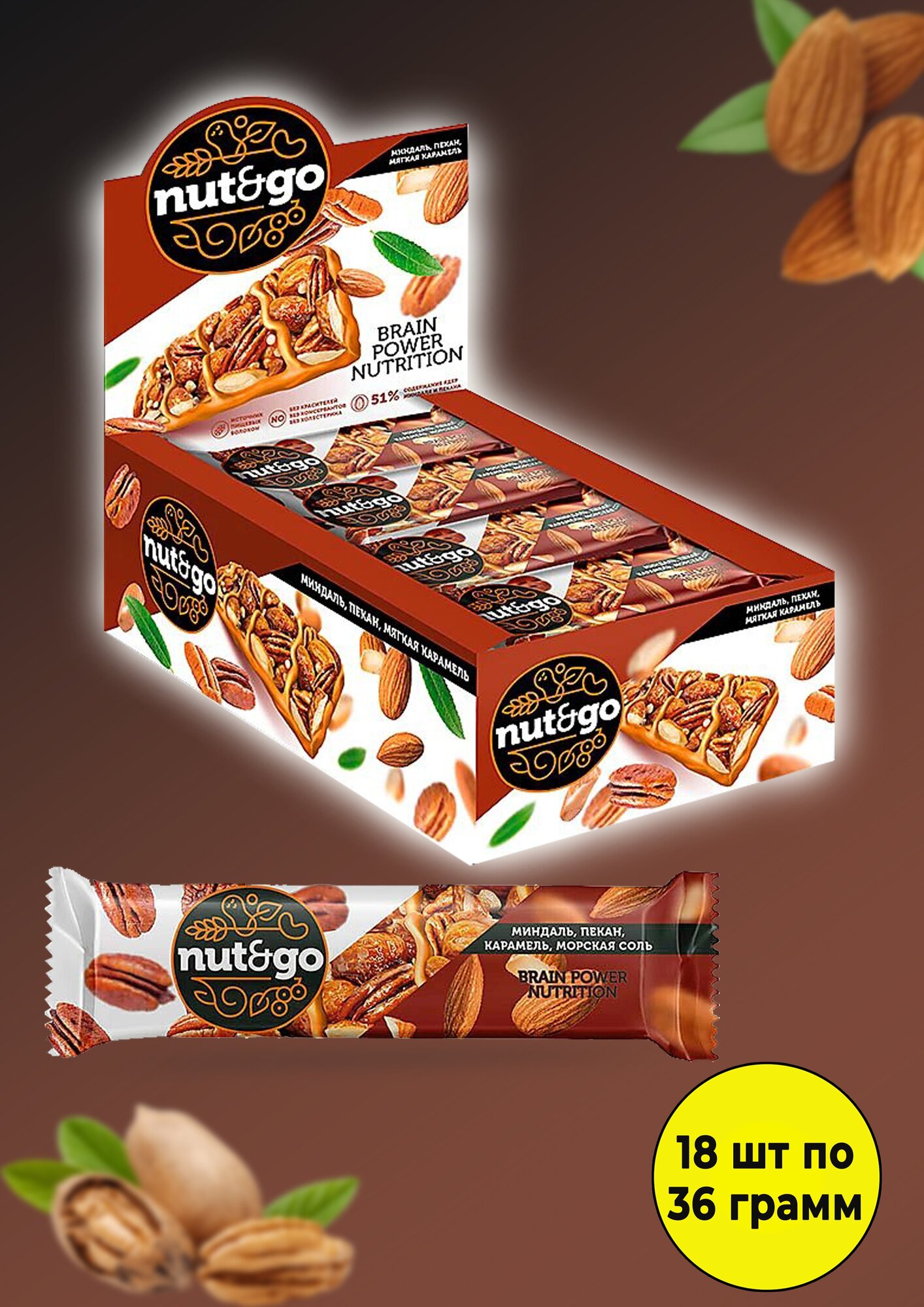 Nut&Go, батончик с миндалём, пеканом, карамелью, морской солью, 36 г (упаковка 18 шт.)