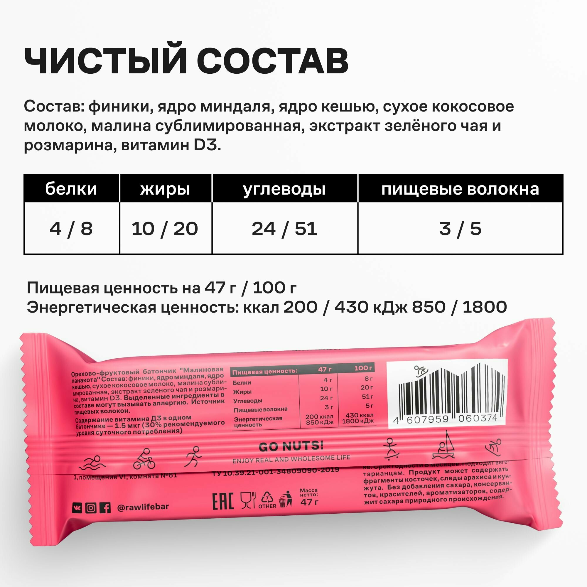 Батончики R.A.W.LIFE Fruit&Nut Bar / Набор полезных пп сладостей орехово-фруктовых без сахара, лактозы и глютена / Малиновая панакота 3 шт по 47г