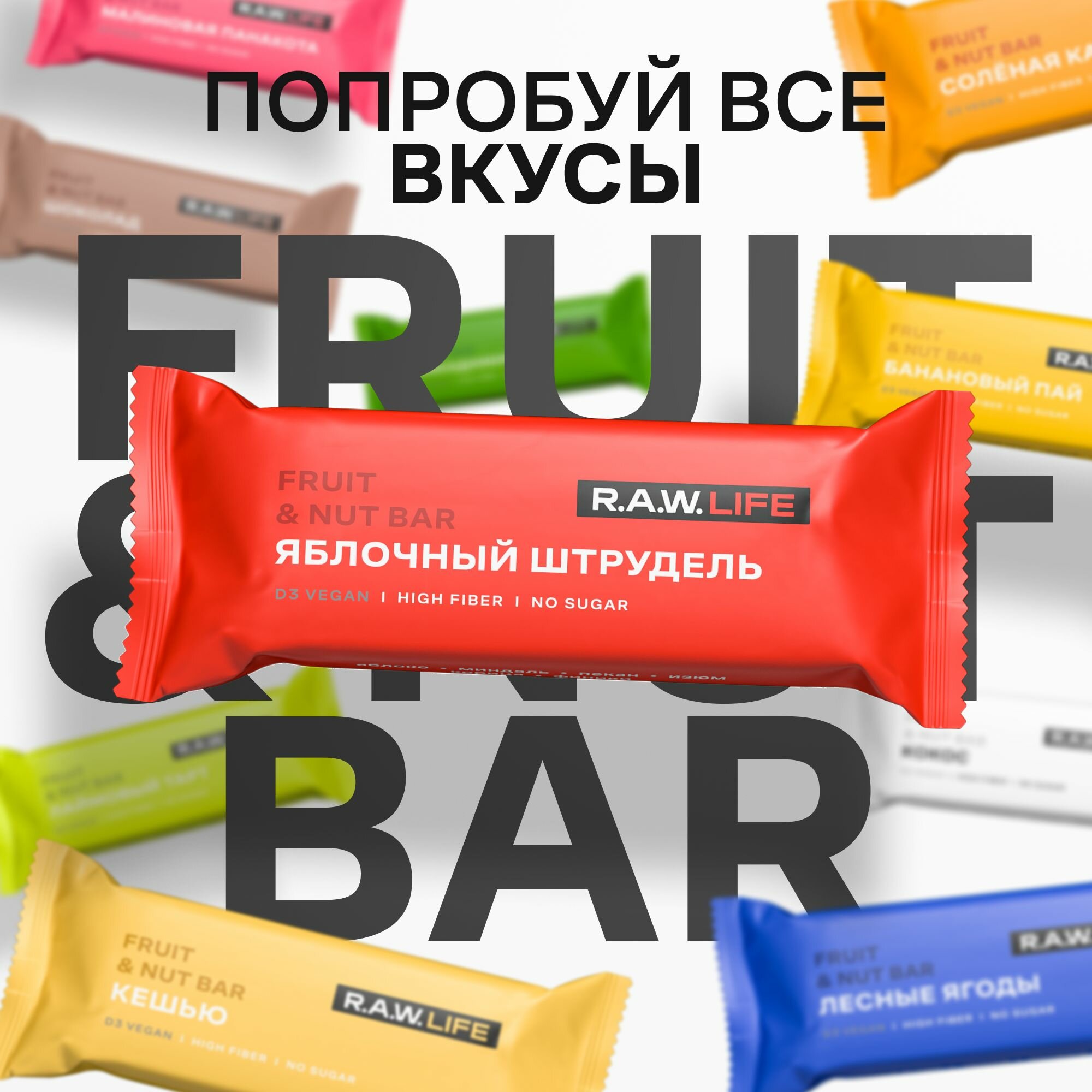 Батончики R.A.W.LIFE Fruit&Nut Bar / Фруктово-ореховый бокс полезных пп сладостей без сахара, лактозы и глютена / Яблочный штрудель 15 шт по 47 гр