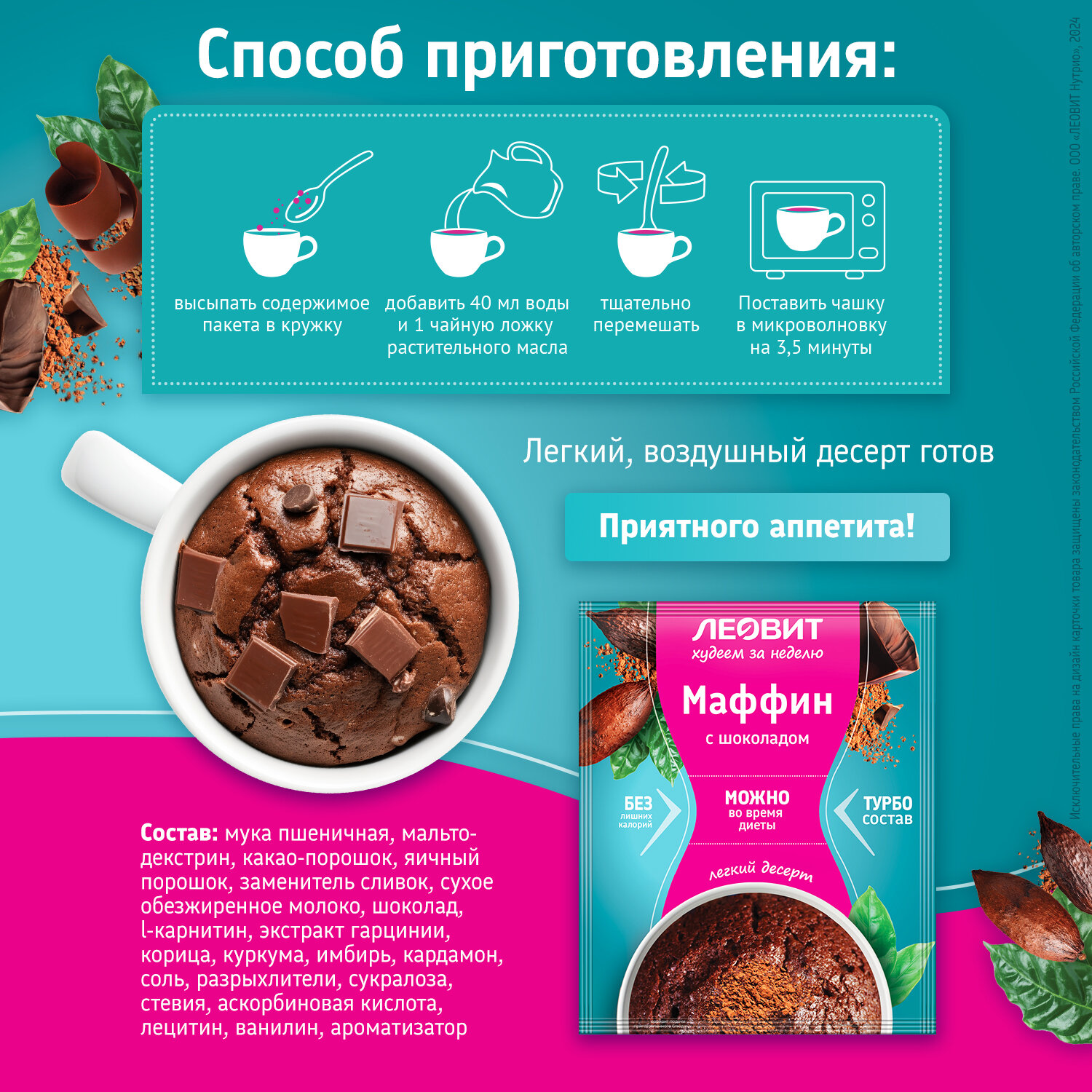 Маффин с шоколадом 5 шт. по 40 гр. жиросжигатель для похудения Худеем за неделю Леовит быстрого приготовления интересное: