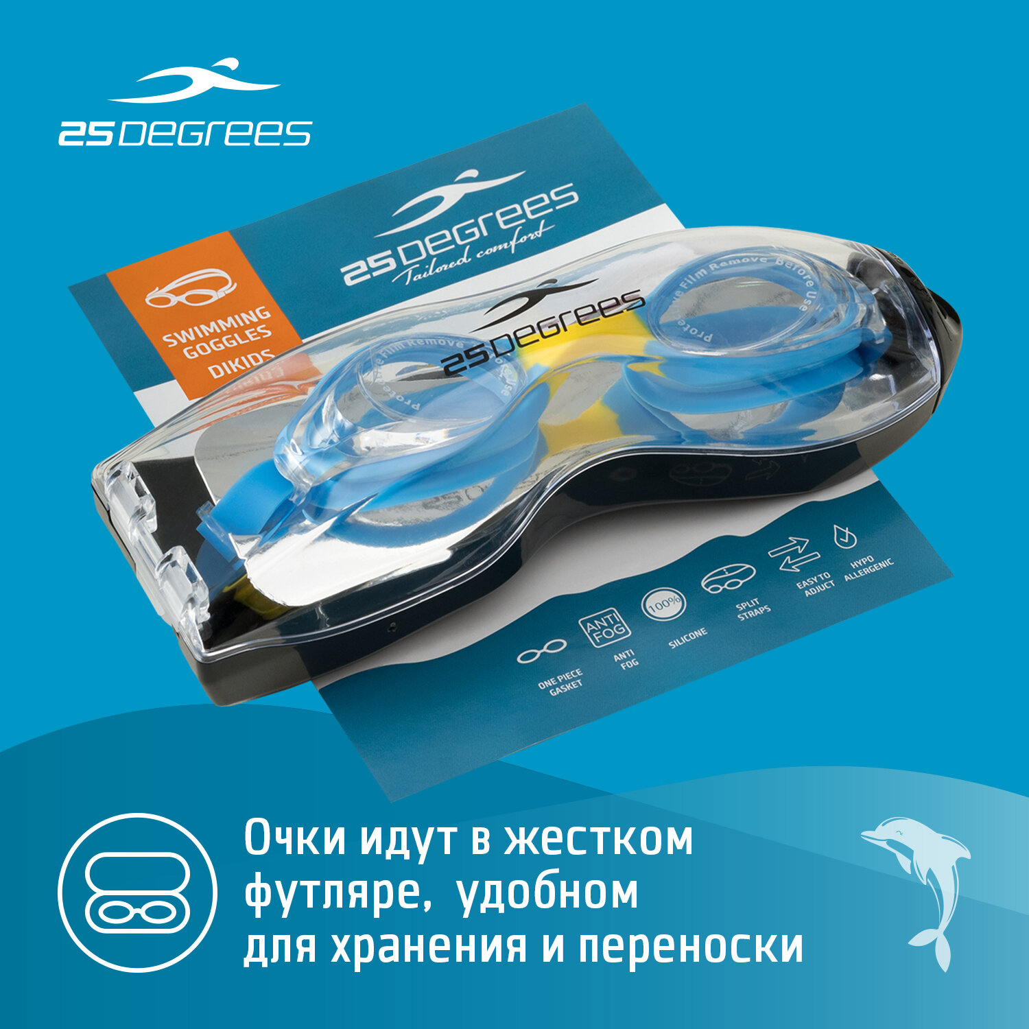 Купить Очки для плавания 25DEGREES Dikids синие детские с футляром, антифог