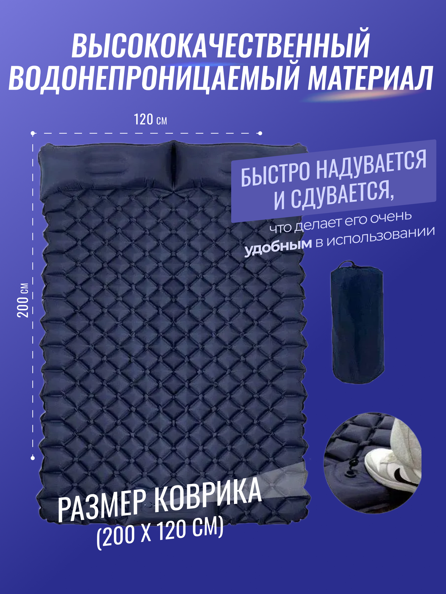 Надувной коврик-палатка "Кемпинг", ТПУ, 200x120x7 см, ручной насос, синий