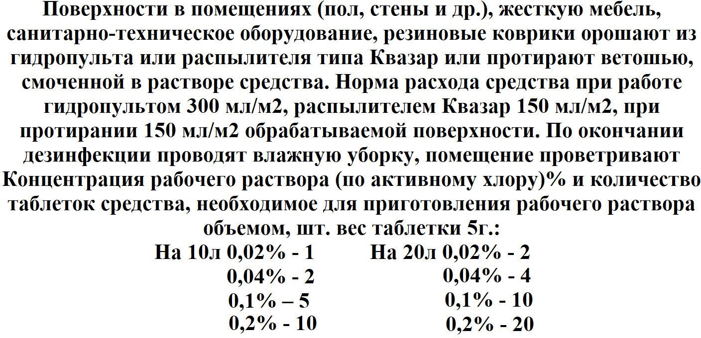 | Особые указания | все работы со средством и его растворами проводить с защитой кожи рук резиновыми перчатками; работы с растворами средства способом орошения требуют защиты органов дыхания универсальными респираторами типа РПГ-67 или РУ-60М с патроном марки «В» и глаз - герметичными очками; обработку следует проводить в отсутствие больных и пациентов; обработанные помещения проветривают в течение 15-30 мин; обработку поверхностей в помещениях способом протирания можно проводить без средств защиты органов дыхания, но в отсутствии пациентов; обработанные помещения проветривают в течение 15-30 мин |