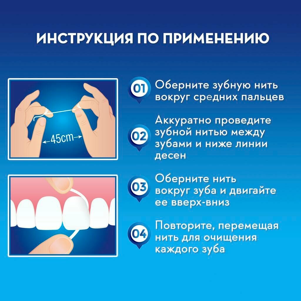 | Способ применения | оберните зубную нить вокруг средних пальцев; Аккуратно проведите зубной нитью между зубами и ниже линии десен; Оберните нить вокруг зуба и двигайте ее вверх-вниз; Повторите, перемещая нить для очищения каждого зуба |
