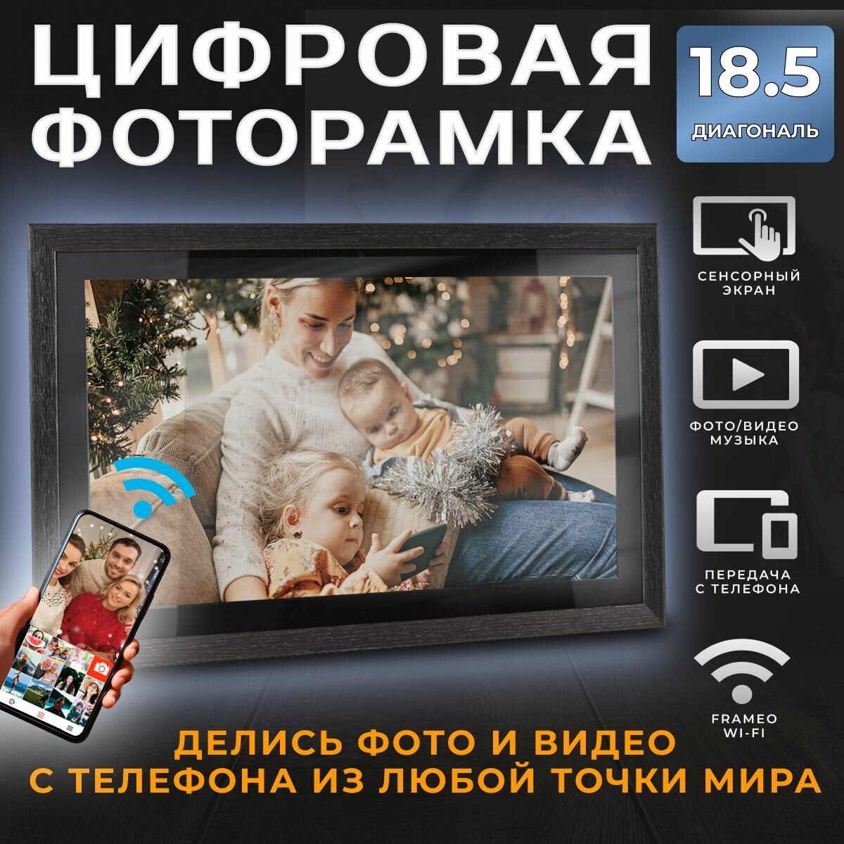 Умная Цифровая фоторамка FRAMEO, экран 18.5 дюйм Темно-коричневая.TOUCH SCREEN SMART WI-FI Photo Frame Сенсорный экран, фото, видео и звук. Работает по ВАЙ-ФАЙ. 1280x800 пикселей.