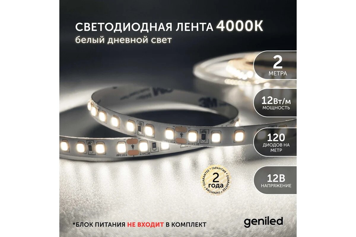 Купить Светодиодная лента Geniled 2м 12В 12Вт/м 4000К IP33 нейтральная дневная подсветка 120 led/m 03581