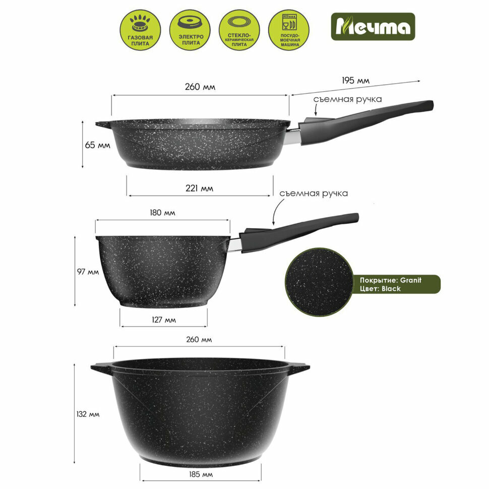 Купить Набор посуды (сковорода 26 см, кастрюля 5 л, ковш 1,7 л, 2 съемных ручки, 2 крышки), мечта "Гранит Black", 001802, 700722