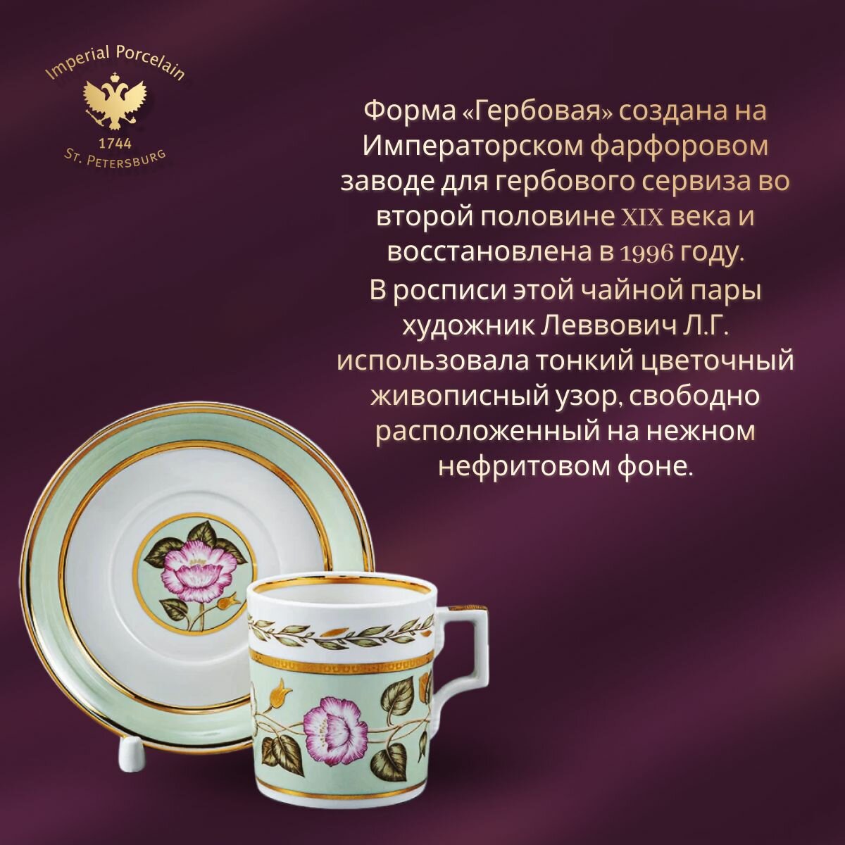 Ниже Вы можете прочитать отзывы на Чайная пара 220 мл. Форма "Гербовая", рисунок "Нефритовый фон № 1". Твердый фарфор. Императорский фарфоровый завод ИФЗ ЛФЗ, ознакомится с подробными характеристиками, посмотреть интересные обзоры и фотографии на Чайная пара 220 мл. Форма "Гербовая", рисунок "Нефритовый фон № 1". Твердый фарфор. Императорский фарфоровый завод ИФЗ ЛФЗ.